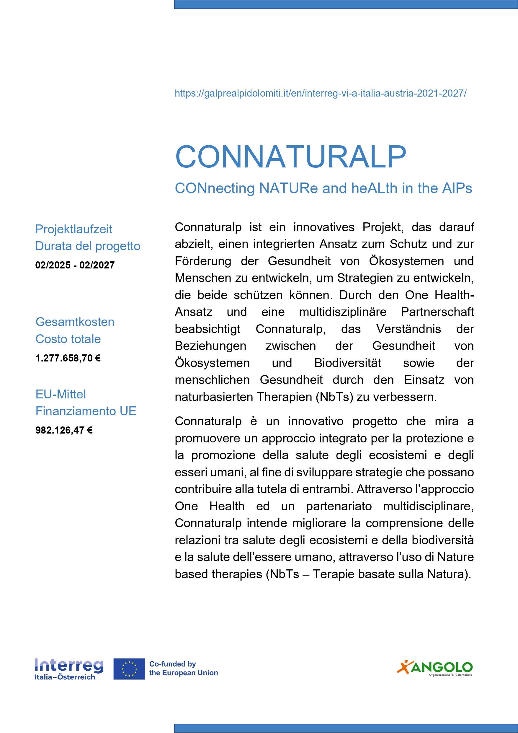 In quanto partner del progetto InterReg Italia-Austria 2025-2027 CONNATURALP – CONnecting NATURe and heALth in the AlPs, capofila il GAL Prealpi Dolomiti, Belluno, ha necessità di affidare un incarico a persona esperta in forest bathing con guida ovvero foresto-terapia (in seguito FB/FT) per  lo svolgimento di specifiche attività previste nel progetto a proprio carico.