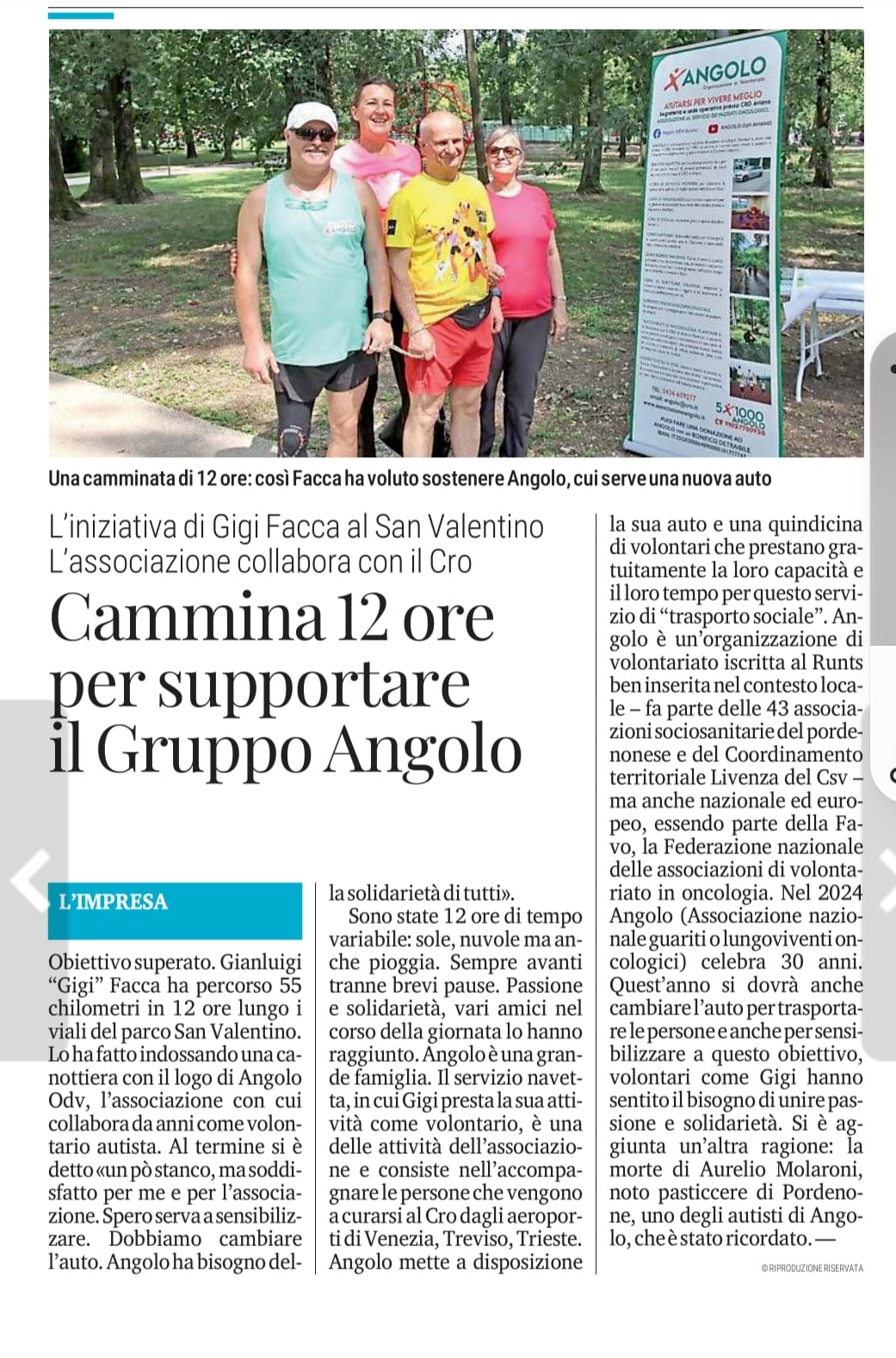 9 luglio 2024. Gian Luigi Facca, Gigi per gli amici, volontario autista del servizio di trasporto sociale, ha partecipato alla staffetta 10×1 ora organizzata da sezione AVIS Casarsa – San Giovanni  effettuando in solitaria tutte le 10 ore al fine di far conoscere ANGOLO e le sue attività.