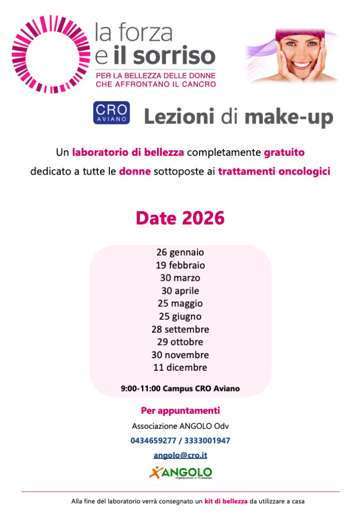 ANGOLO OdV supporta il laboratorio di Make-Up de “La forza e il sorriso” al CRO di Aviano, grazie alla nostra volontaria del Servizio Civile Universale (Progetto FAVO di Riabilitazione Oncologica). Il laboratorio si tiene presso il Campus del CRO. Vi operano estetiste professioniste volontarie in collaborazione con il servizio di Psicologia oncologica.