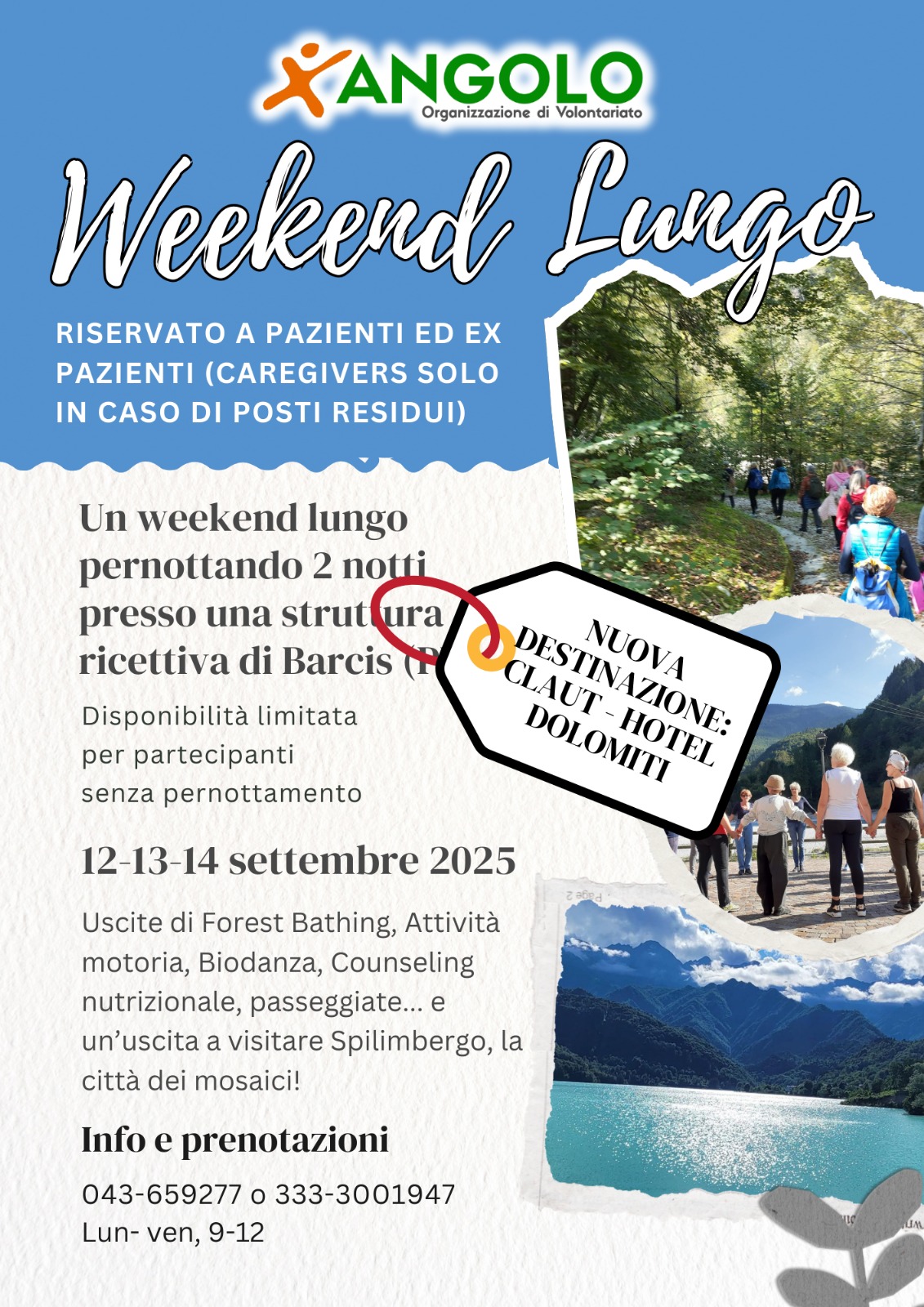 Anche quest’anno ANGOLO propone un weekend lungo a Barcis, dal 12 al 14 settembre! Ci saranno uscite in foresta, biodanza, attività motoria, counseling nutrizionale,… e quest’anno anche un’uscita a Spilimbergo per vedere la città dei mosaici!